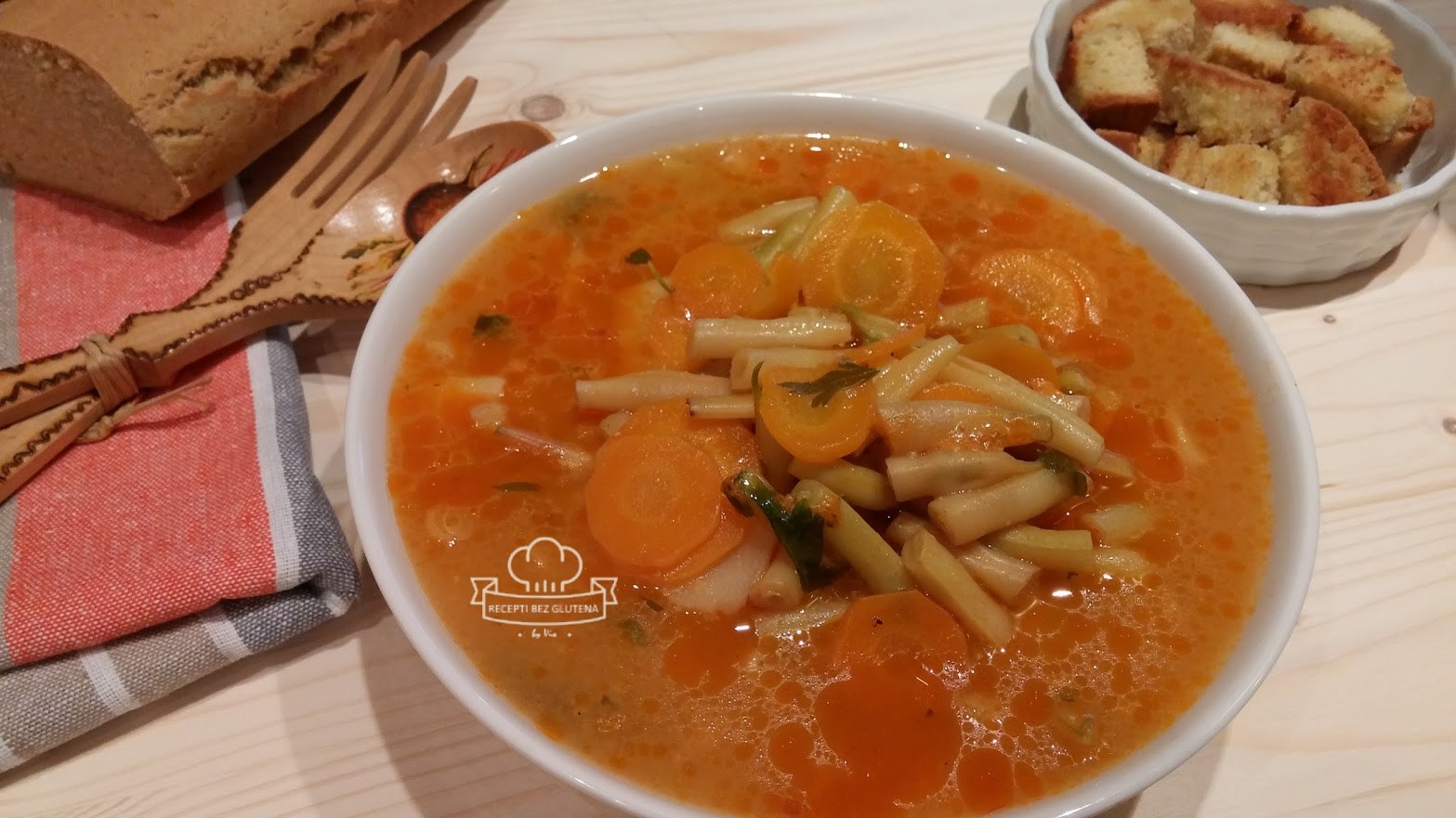 Varivo od mahuna sa tostiranim kockicama kruha od slanutka