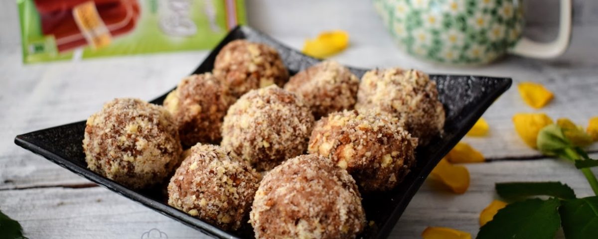 Količinu keksa i lješnjaka prilagodimo tome da možemo praviti kuglice, žlicom uzimamo smjesu, dlanovima oblikujemo kuglicu i u valjamo u nasjeckane lješnjake.