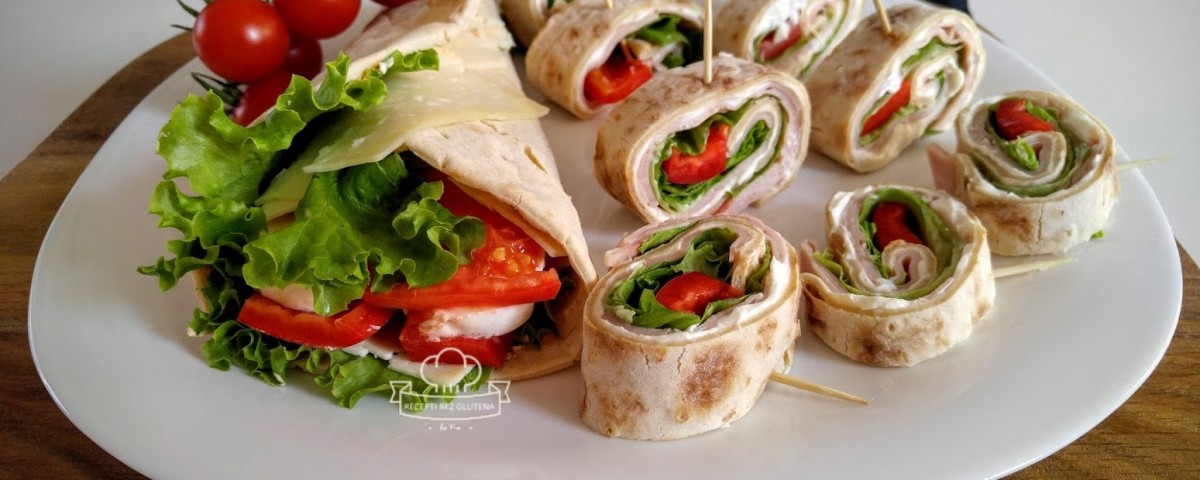 Tortilju umotamo ravno u obliku valjka i probadamo čačkalicama na razmake koliko želimo da nam budu debili kolutovi koje odmah potom režemo.