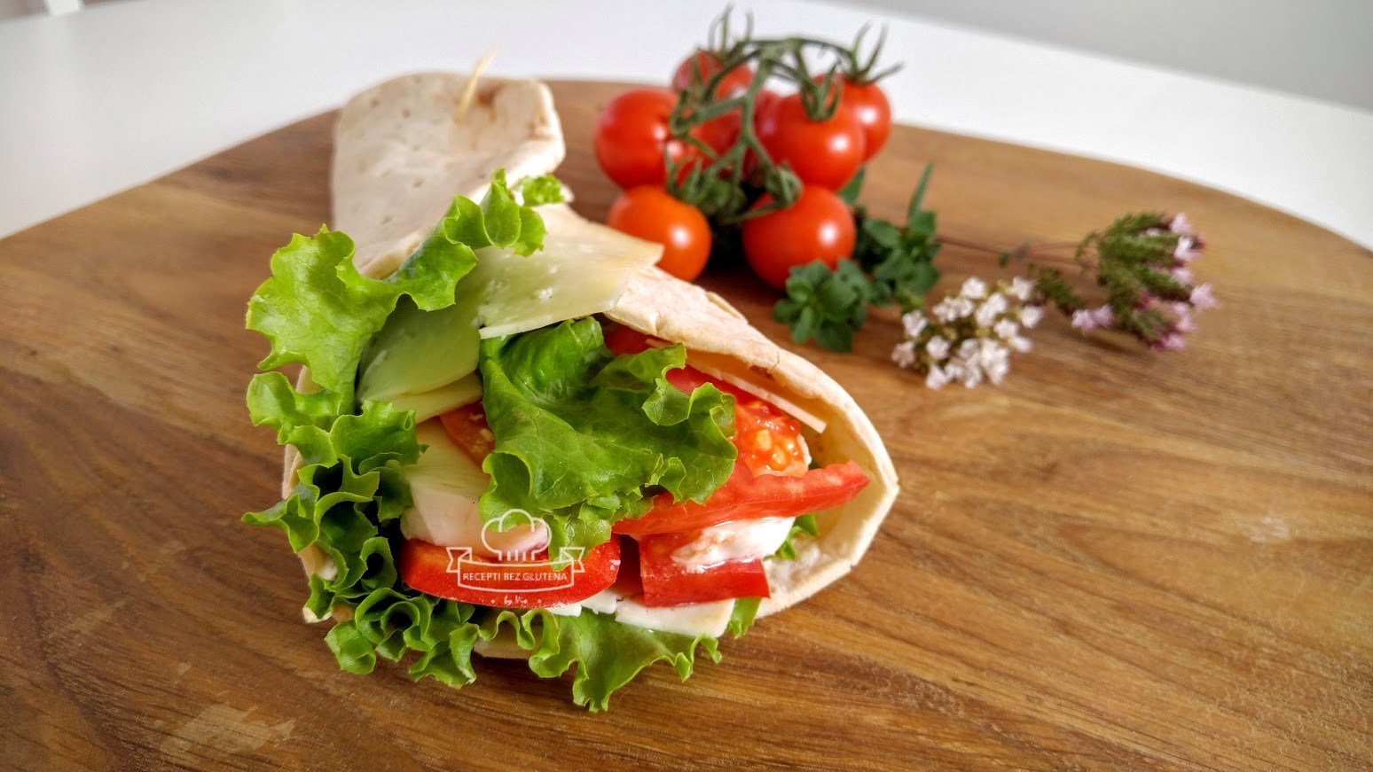Tortilju umotamo ravno u obliku valjka i probadamo čačkalicama na razmake koliko želimo da nam budu debili kolutovi koje odmah potom režemo.